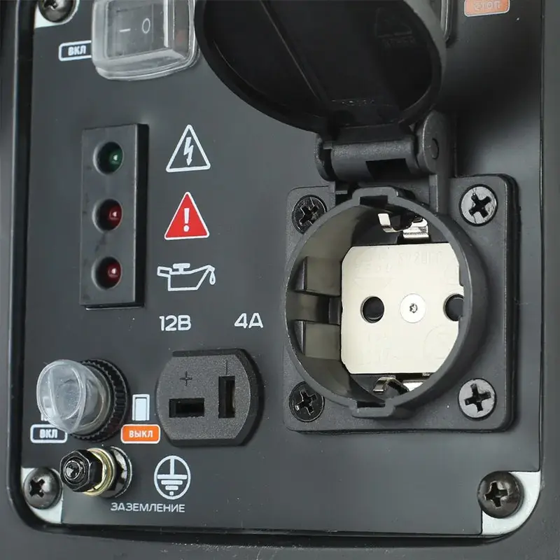 Для подключения потребителя на лицевой панели размещена розетка 220 В. Защитная крышка не позволит попасть пыли и грязи внутрь пока модель хранится в гараже, мастерской или стоит на природе. Есть также дополнительный выход на 12 В. Если у вас есть машина, то к генератору можно подключить автомобильный аккумулятор для подзарядки.