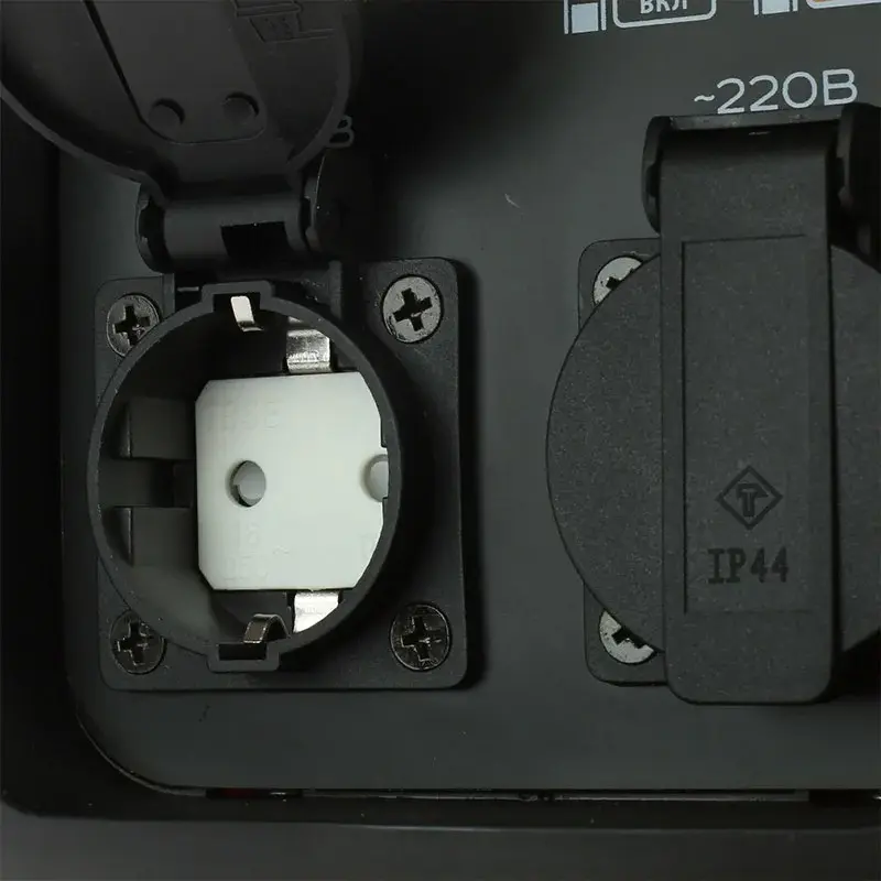 На лицевой панели есть две розетки 220 В для подключения потребителей. Каждый выход оснащен защитной крышкой, которая не допустит попадания грязи внутрь. Благодаря этому генератор можно хранить в пыльном помещении.