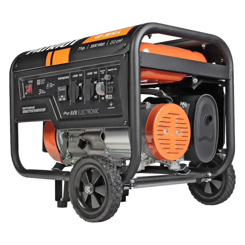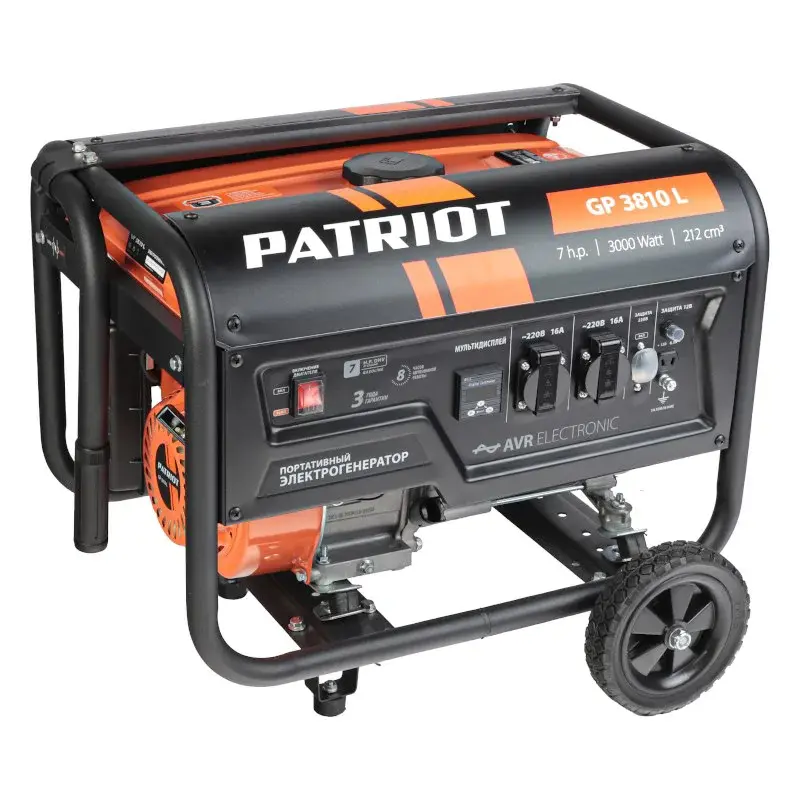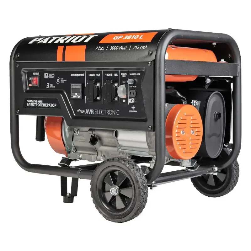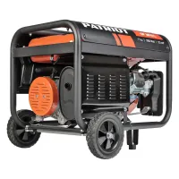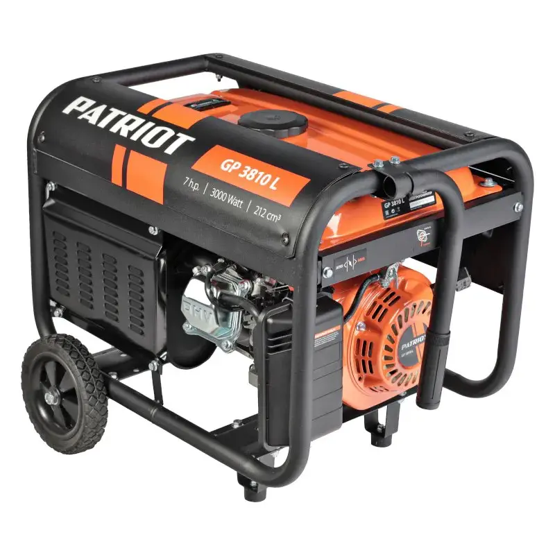 Бензиновый генератор Patriot GP 3810L используется для питания одного или нескольких однофазных потребителей суммарной мощностью 2,8 кВт. Модель оснащена транспортировочным комплектом для удобного перемещения по рабочей площадке: есть колеса и складная транспортировочная ручка.
