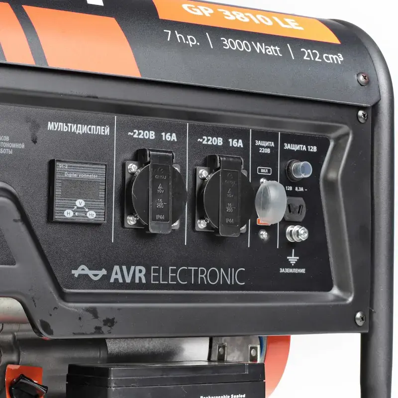 Для подключения потребителей на корпусе расположено 2 розетки 220 В. Каждая оснащена защитной крышкой, чтобы предотвратить попадание пыли, влаги и грязи. Бензиновый электрогенератор способен запитать технику, которая не превысит номинальную мощность в 2,8 кВт. На панели управления также расположен дополнительный выход на 12 В для подзарядки севшего автомобильного аккумулятора.
