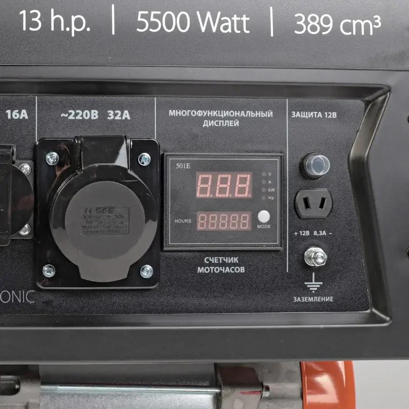 Для подключения потребителей на корпусе бензинового генератора предусмотрено несколько выходов: 2 розетки на 16 А, а также одна силовая на 32 А. Подключать можно любое оборудование, которое соответствует возможностям бензиновой электростанции: от строительного электроинструмента и бытовой техники до станков и сварочных аппаратов. Помимо этого, вы также можете подзаряжать автомобильный аккумулятор. Для этого предусмотрен выход на 12 В.