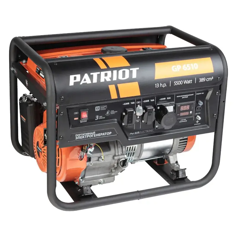 Бензиновый генератор Patriot GP 6510 используется для питания оборудования суммарной мощностью до 5 кВт. Для отслеживания рабочих параметров есть дисплей, а для своевременной дозаправки маслом предусмотрен встроенный датчик.