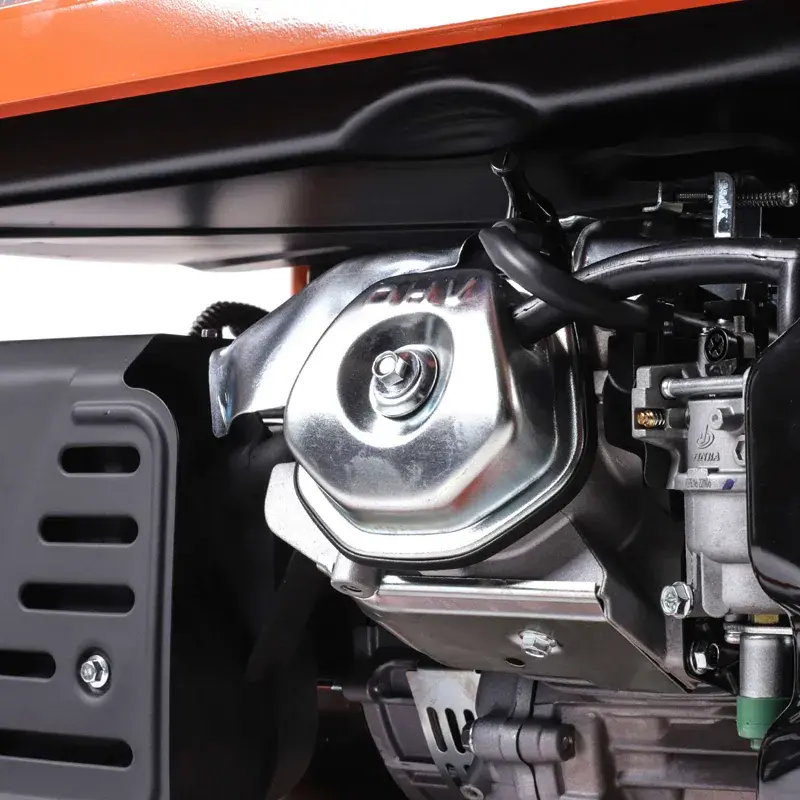 Металлическая рама, огибающая весь корпус, усиленная передняя панель и утопленные элементы управления снижают вероятность механических повреждений. Нижняя часть рамы служит устойчивой опорой, а верхняя — держателем для переноски электрогенератора.