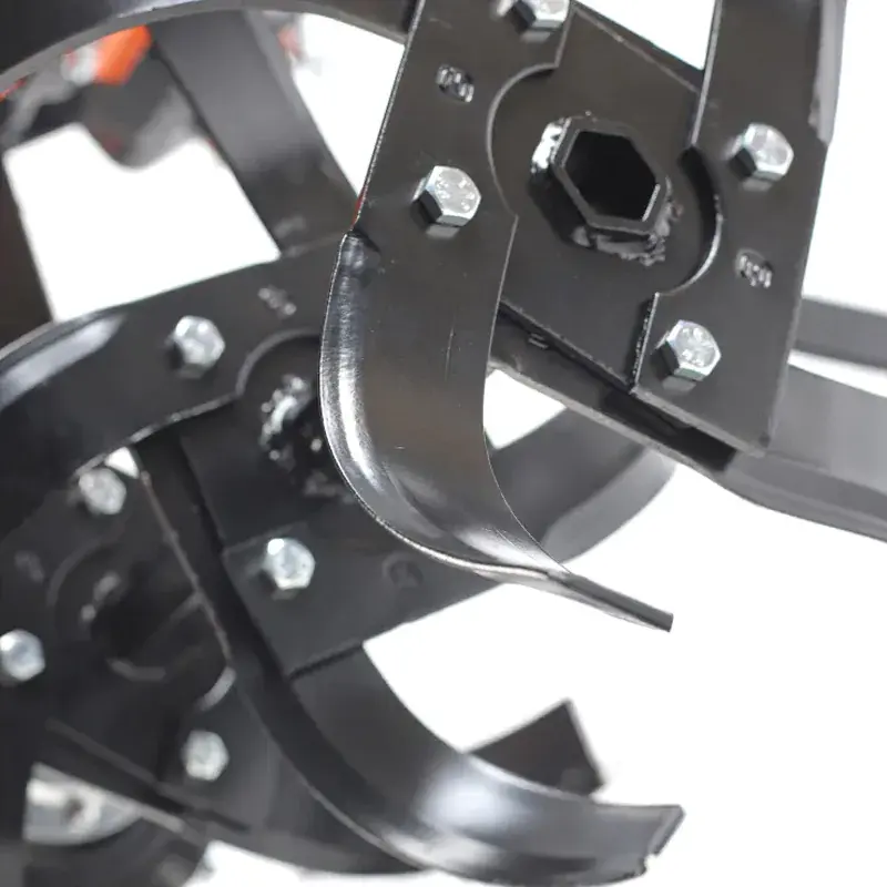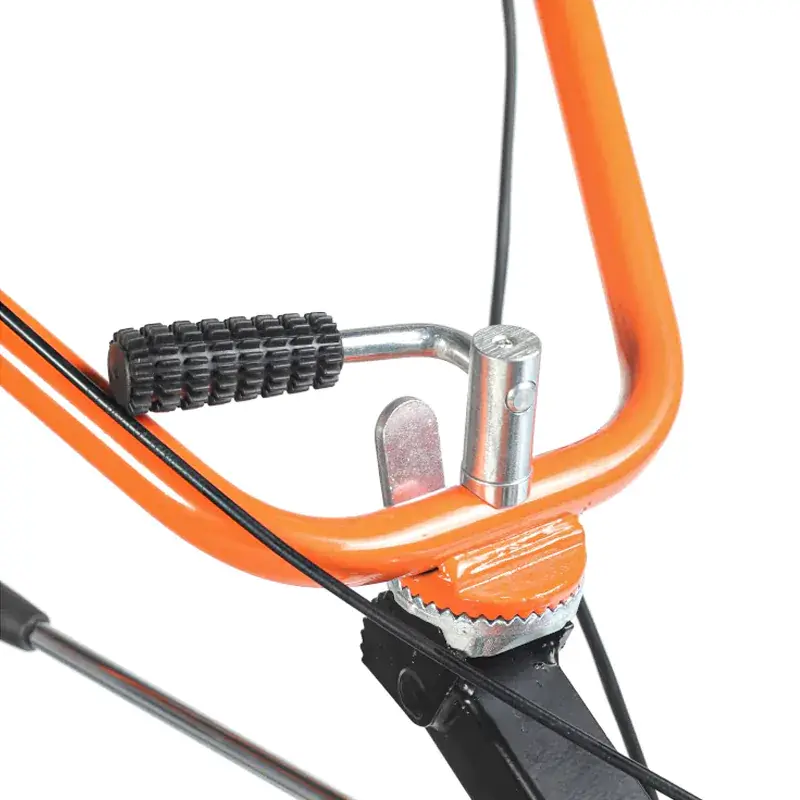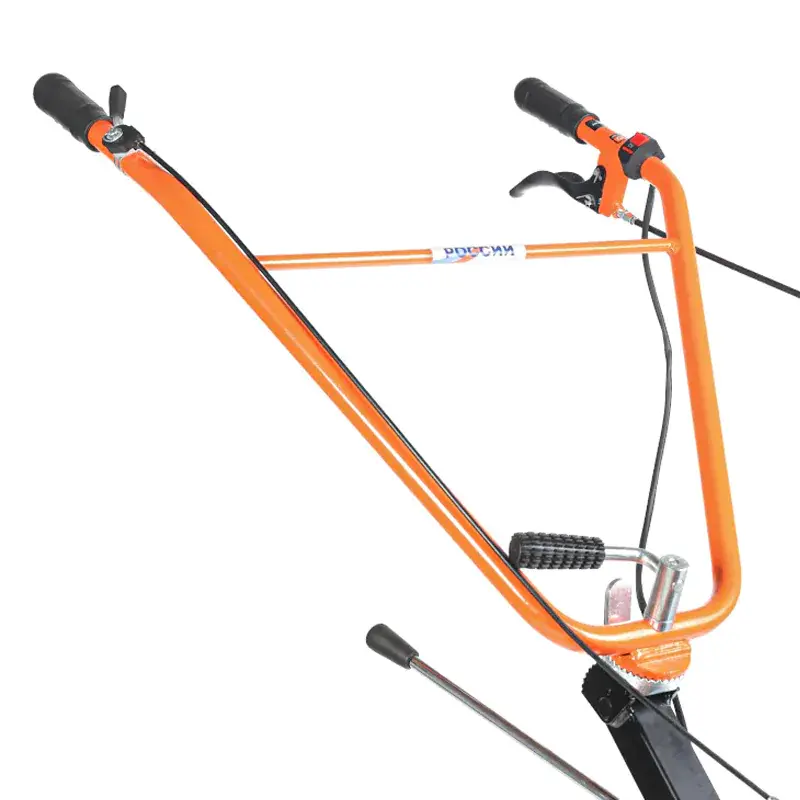 На руле находится фиксатор, при помощи которого можно выполнить регулировку по высоте. Выключатель зажигания на правой рукоятке позволяет мгновенно заглушить двигатель в экстренной ситуации. Бензин удобно заливать благодаря широкой горловине топливного бака. Широкие кожухи над колесами защищают от летящих из-под фрез комьев земли.