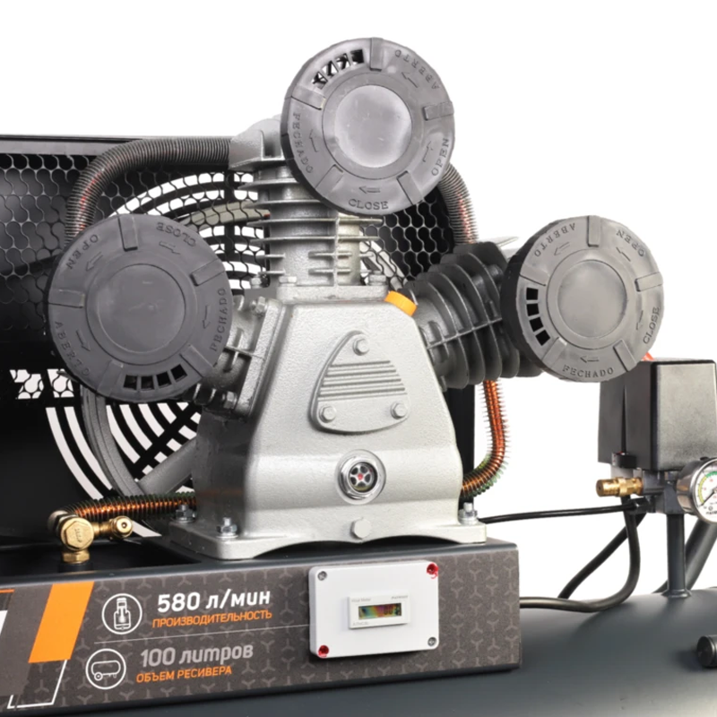 Профессиональный компрессор масляный для пневмоинструмента на сервисных, ремонтных и прочих работах, небольших производствах, в сферах услуг. Производительности 580 л/мин (34,8 м3/ч) достаточно для пескоструйных, монтажных и строительных работ. При подключении подходящего пневмоинструмента, справится с такими задачами, как продувка труднодоступных мест, подкачка шин, нанесение смазочных материалов. Быстросъемный штуцер (_") и кран с вентилем для подключения пневмоинструмента. Объем ресивера — 100 л.