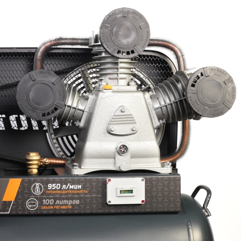 Профессиональный компрессор масляный для пневмоинструмента на сервисных, ремонтных и прочих работах, небольших производствах, в сферах услуг. Производительности 950 л/мин (57 м3/ч) достаточно для пескоструйных, монтажных и строительных работ. При подключении подходящего пневмоинструмента, справится с такими задачами, как продувка труднодоступных мест, подкачка шин, нанесение смазочных материалов. Быстросъемный штуцер (_") и кран с вентилем для подключения пневмоинструмента. Объем ресивера — 100 л. Работает от напряжения 400 В, предназначен для использования в трёхфазной сети.