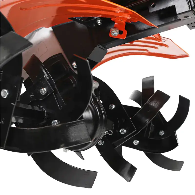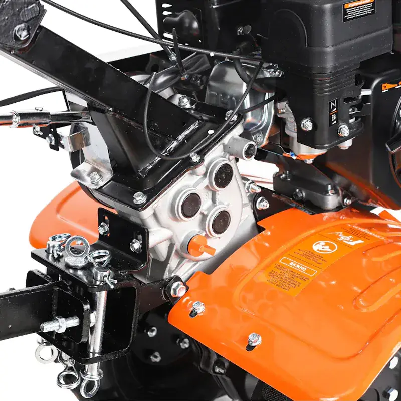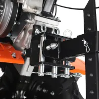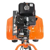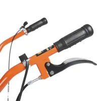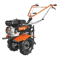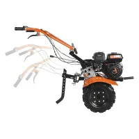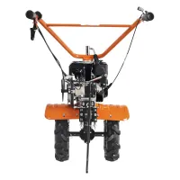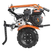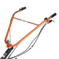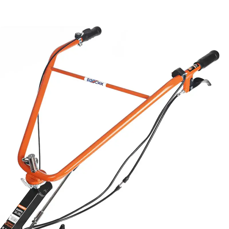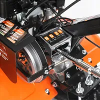 Бензиновый мотоблок оборудован рулем, на котором расположены все основные элементы управления: сцепление и регулировка оборотов двигателя. Длинный рычаг переключения передач избавляет от необходимости наклоняться для выбора нужной скорости. Задний ход повышает маневренность машины и упрощает ее извлечение в случае увязывания в почве. Глубину вспашки легко регулировать путем перемещения сошника. Пониженная скорость обеспечивает безопасность работы благодаря плавному началу движения без рывков. В этом режиме удобно работать с сеялкой и другим навесным оборудованием, требующим медленного перемещения.