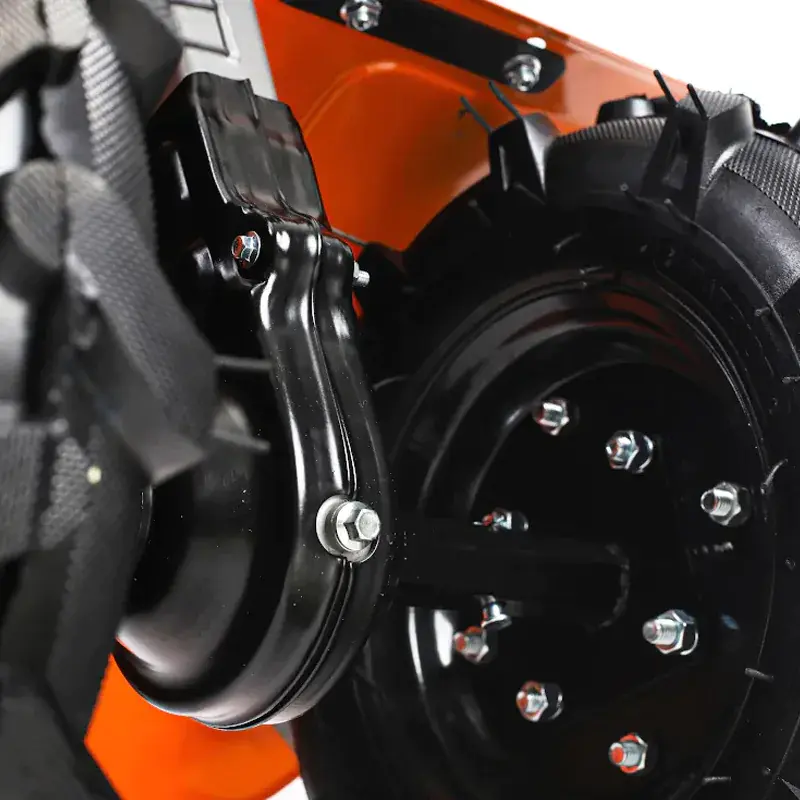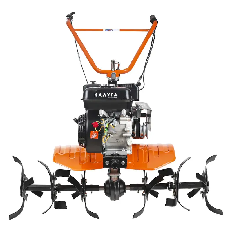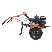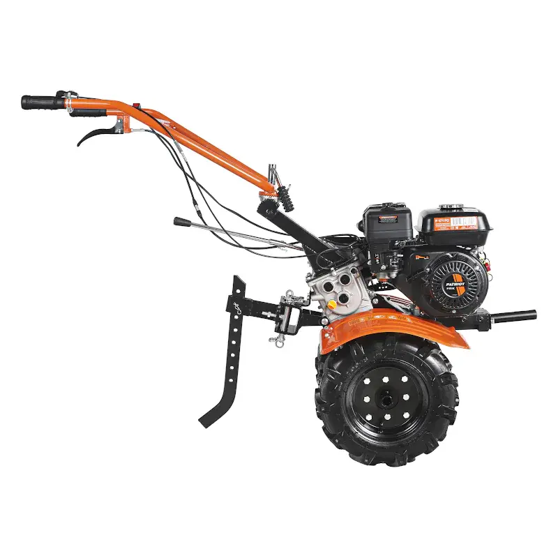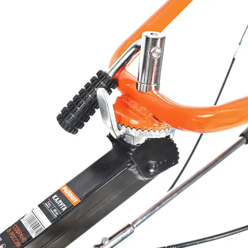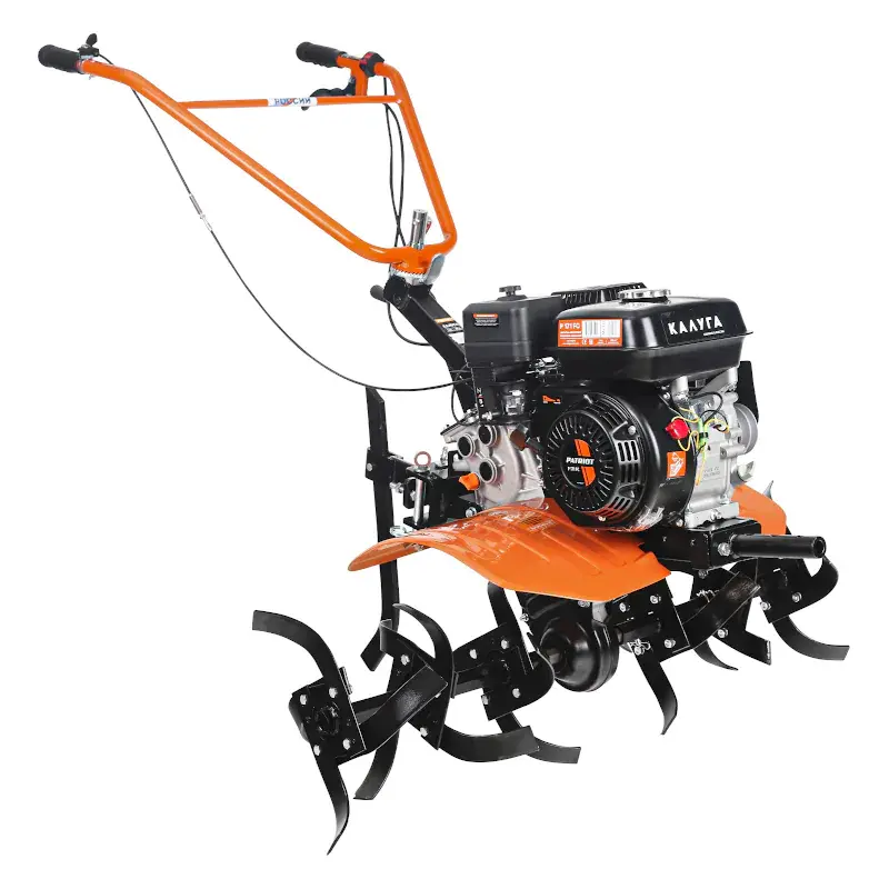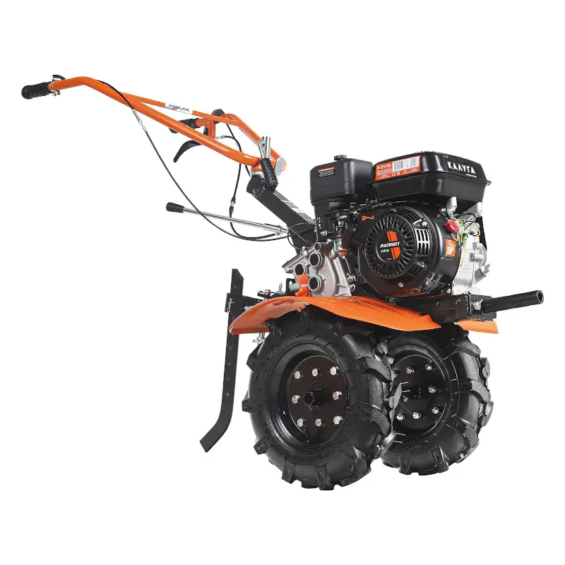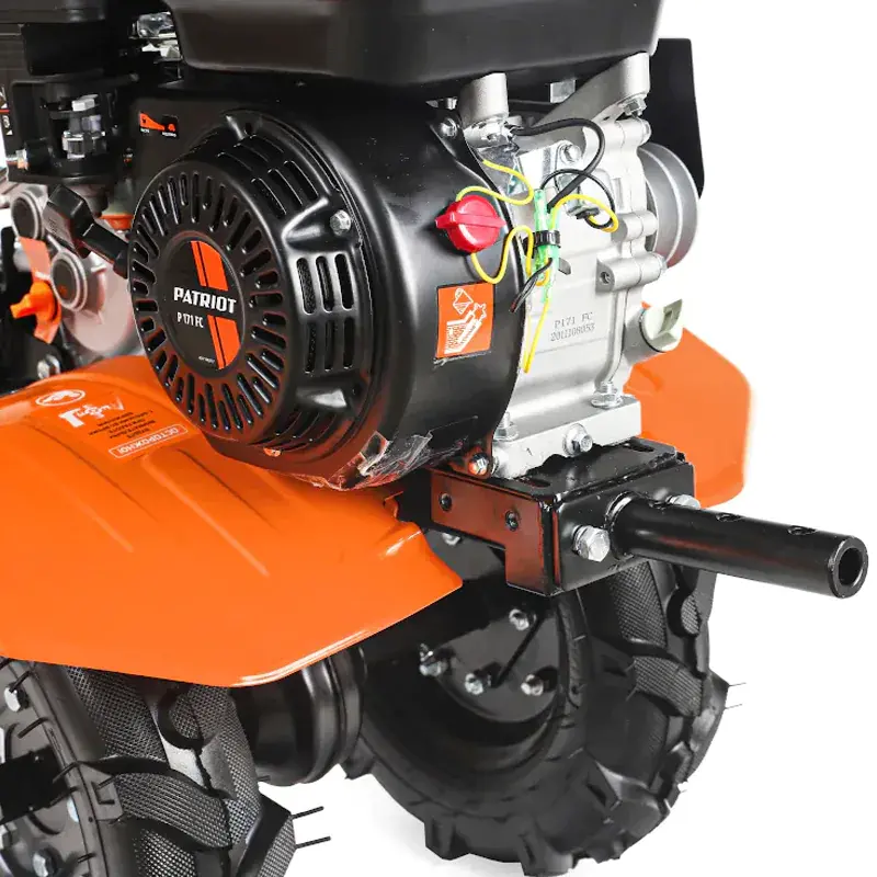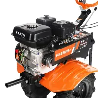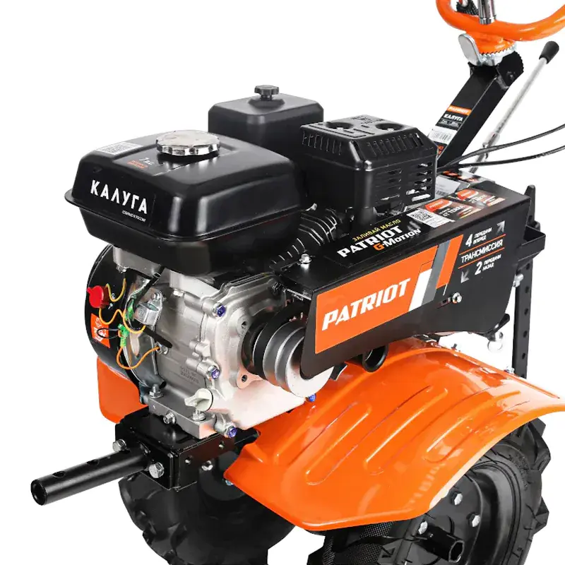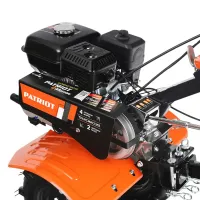 Мотоблок PATRIOT КАЛУГА оснащен колесными покрышками с высокими рельефными протекторами, которые отличаются хорошим сцеплением с грунтом и маневренностью. Металлические крылья защищают от вращающихся частей мотоблока и летящих во время работы комьев земли. Продолжительная работа без дозаправки гарантирована благодаря вместительному топливному баку. Используемый в качестве трансмиссии шестеренчатый редуктор в алюминиевом корпусе с масляной ванной обеспечивает долгий срок службы и высокую надежность мотоблока. Рукоятку можно сложить на время хранения.