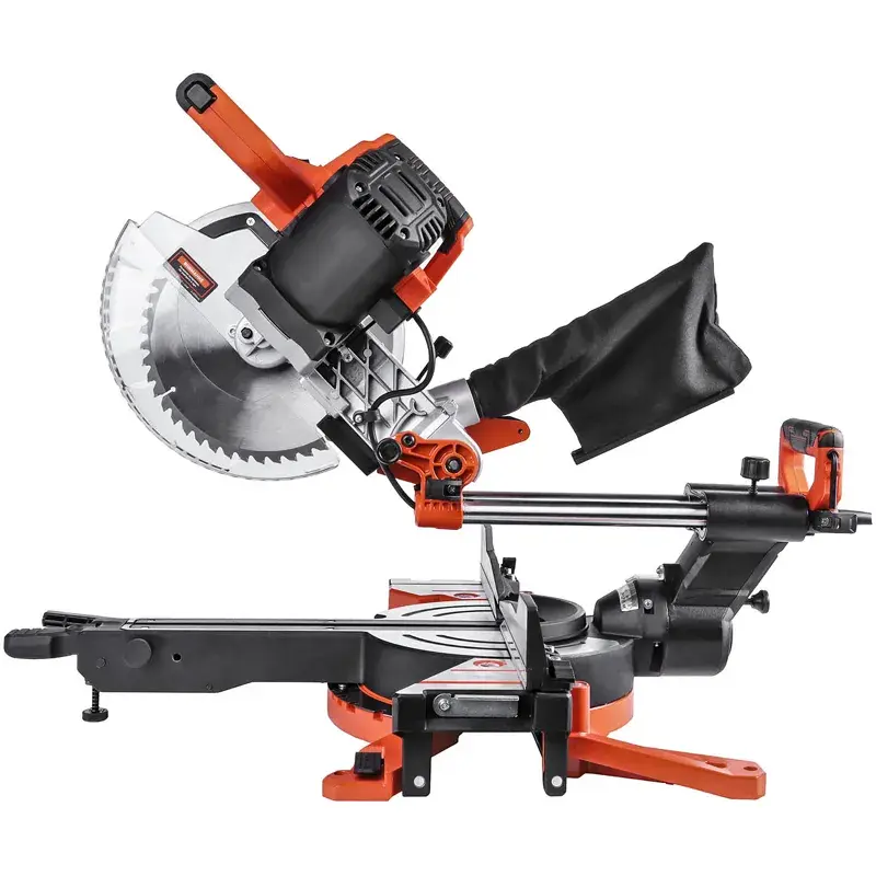 За счет возможности поворота рабочего стола и наклона пильного диска с помощью инструмента можно выполнять резы под углом в двух плоскостях. Механизм протяжки обеспечивает удобство распила габаритных деталей. К отводному патрубку на корпусе можно подключить строительный пылесос или пылесборник для удаления пыли и стружек из рабочей зоны.