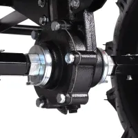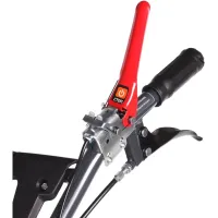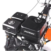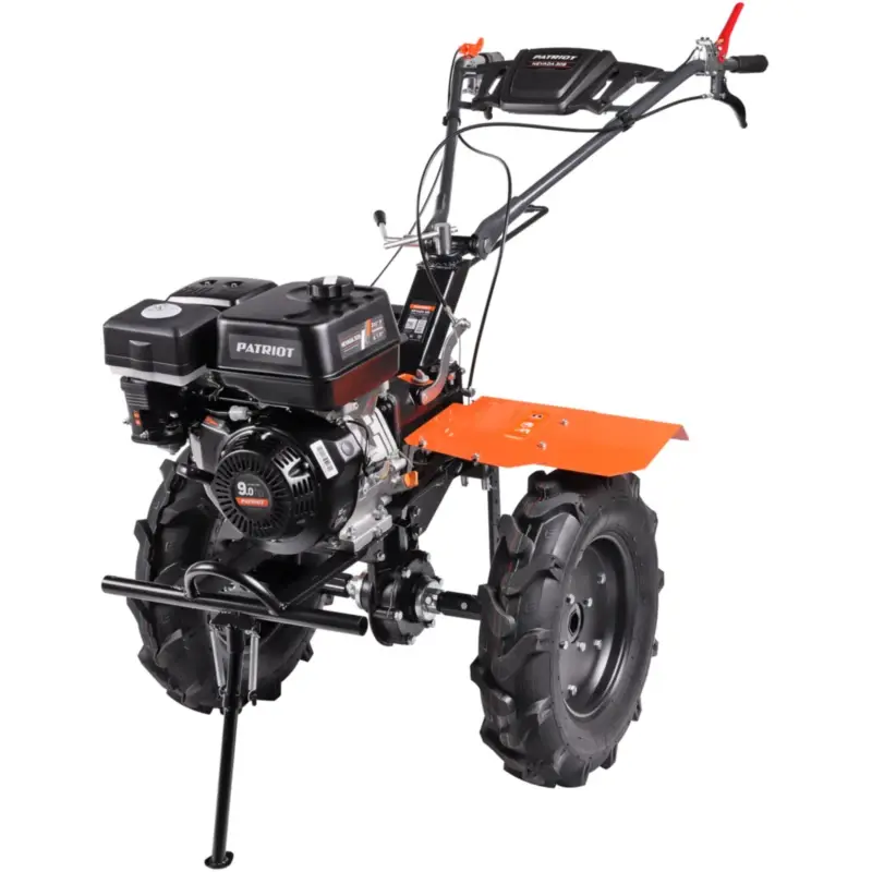 Крепкие ручки и усиленная рама делают мотоблок подходящим для тяжелых задач. Руль оснащен кнопкой включения, рукояткой газа, рычагами привода и кейсом для инструментов, его наклон регулируется. Металлическая подножка с ручкой упрощает установку фрез. Мотоблок перемещается на колесах типа P5,00-12D-1 с рельефным протектором, обеспечивающим надежное сцепление с грунтом.