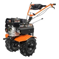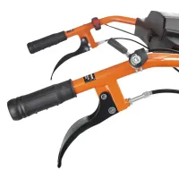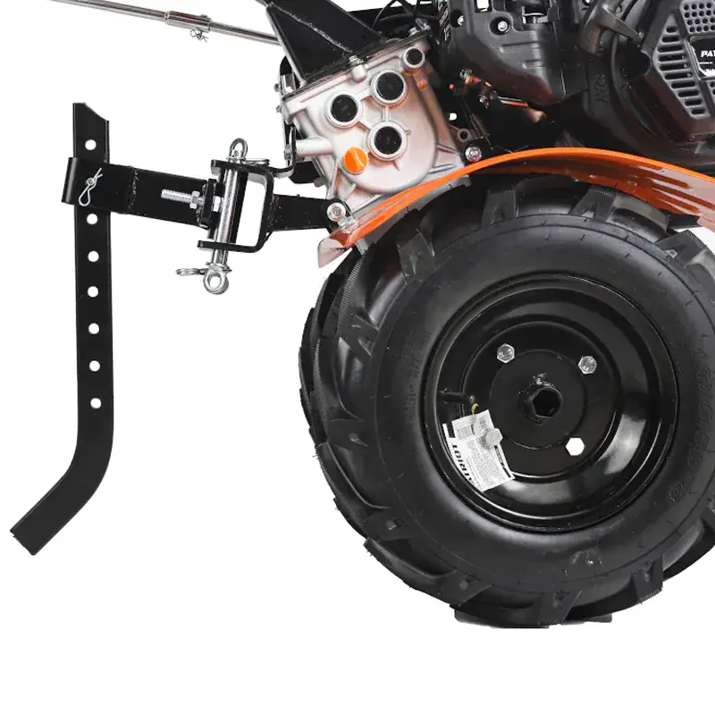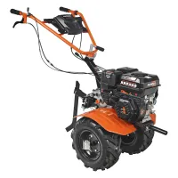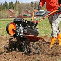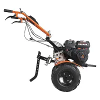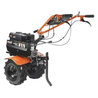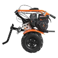 На рулевой рукоятке бензинового мотоблока располагается фиксатор, при помощи которого можно выполнить регулировку по высоте. Благодаря инструментальному ящику, установленному на руле, все нужные инструменты всегда под рукой. Широкий диапазон передач позволяет выбрать оптимальную скорость движения в зависимости от структуры и влажности почвы. Выключатель зажигания удобно расположен под правой рукой, что позволяет мгновенно заглушить двигатель в экстренной ситуации. Задний ход облегчает маневрирование и вытаскивание застрявшей в земле машины. Глубина культивации регулируется установкой высоты сошника.