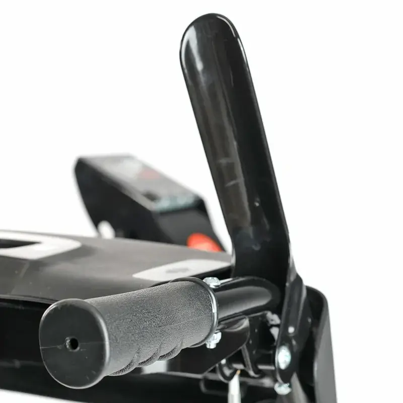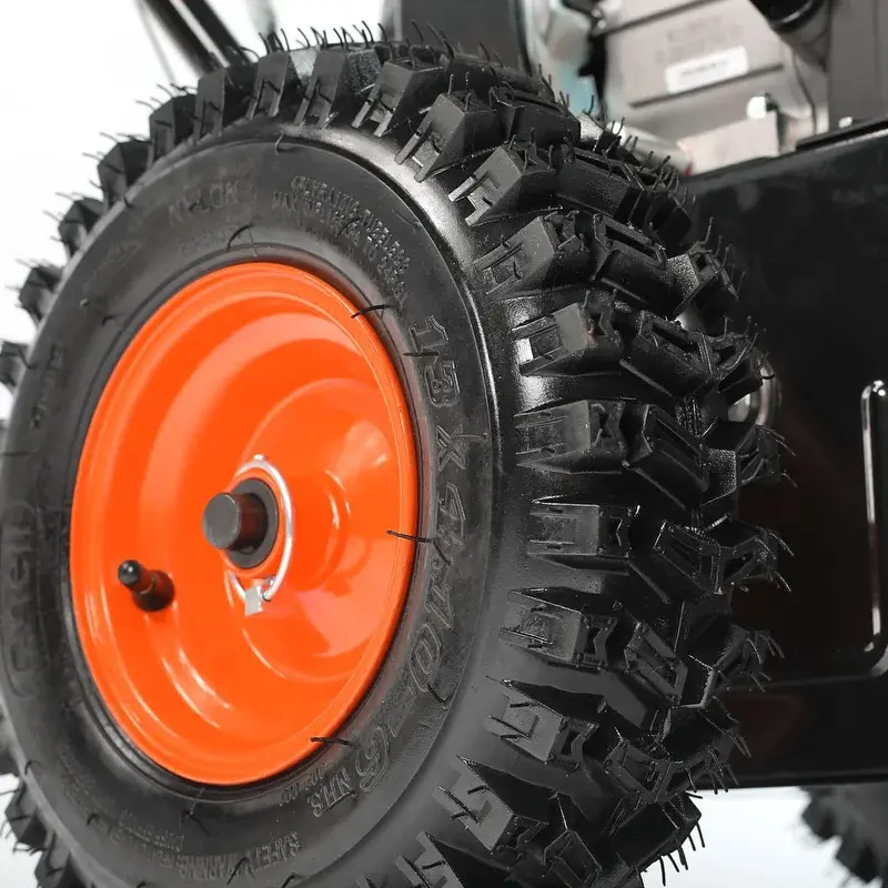 Самоходный снегоуборщик с шириной захвата 56 см оснащен большим ковшом из прочного металла толщиной 3 мм. Вы можете настроить высоту его подъема с помощью регулируемых опорных лап, это необходимо при очистке неровных поверхностей, например плитки или гравийных дорожек.
