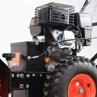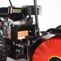 Щетку бензинового снегоочистителя можно использовать не только летом, но и зимой. Например, чтобы бережно очистить ледяной каток от тонкого слоя снега. А летом щетка для подметания пригодится, чтобы убрать пыль, землю и легкий мусор с дорожек. При этом её поворот настраивается отдельным рычагом, а степень прижима высотой подъема опор на дополнительных колесах.