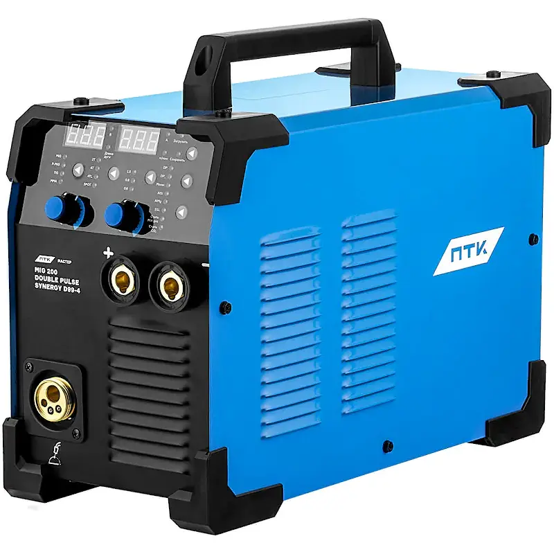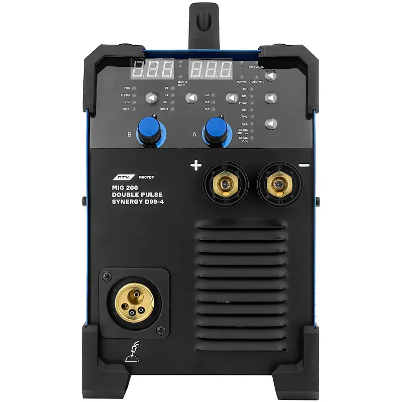 Сварочный полуавтомат ПТК МАСТЕР MIG 200 DOUBLE PULSE SYNERGY D99-4 с максимальным сварочным током 200 А поддерживает синергетический режим управления, а также ММА-, TIG- и импульсную сварку. Поставляется в комплекте с горелкой и дополнительными принадлежностями для работы.