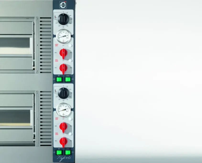 Электромеханическая система управления с возможностью установки температуры в камере и мощности двух блоков нагревательных элементов (верха и пода) по отдельности на минимальную или максимальную мощность.
