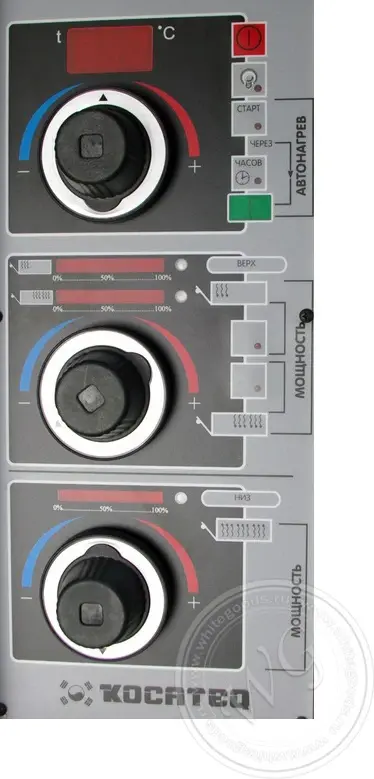 Электро-механическая панель управления: кнопка включения-выключения, кнопка включения подсветки, термостат до 350 градусов Цельсия с цифровым дисплеем, раздельная регулировка мощности верхних и нижних ТЭНов, раздельное включение и регулировка верхних левых и правых ТЭНов;