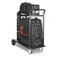 Трехблочный мобильный комплекс с автоматической подстройкой скорости подачи проволоки в MIG/MAG режимах сварки, выносным подающим механизмом, инструментальным ящиком и встроенной тележкой на поворотных колесах с цепным регулируемым креплением баллонов с газом.
