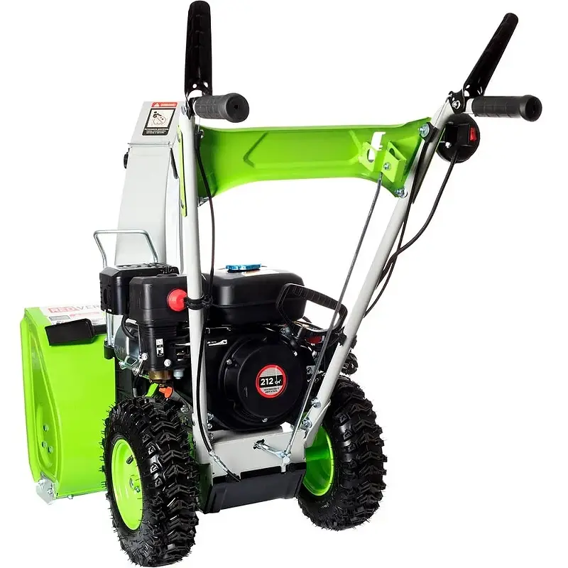 Снегоуборщик оснащен колесами с глубоким протектором, они упрощают перемещение и предотвращают пробуксовку на обледенелых участках.
