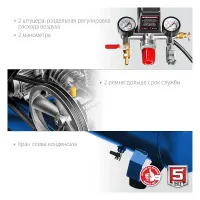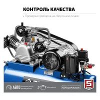 Объем ресивера компрессионной установки — 100 л. Такой емкости достаточно для использования оборудования в профессиональных и бытовых целях – в производстве, строительстве и т.д. Максимальное рабочее давление составляет 10 атм, регулировка осуществляется поворотным рычагом. Следить за показателями можно с помощью аналоговых манометров, отдельных для каждого штуцера.