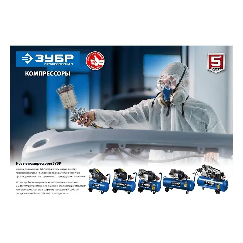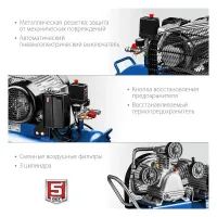 Накрывающий рабочую часть пластиковый кожух предотвращает механические повреждения. Помимо этого, он позволяет избежать контакта с подвижными частями двигателя компрессорной установки Зубр КПМ-530-100.