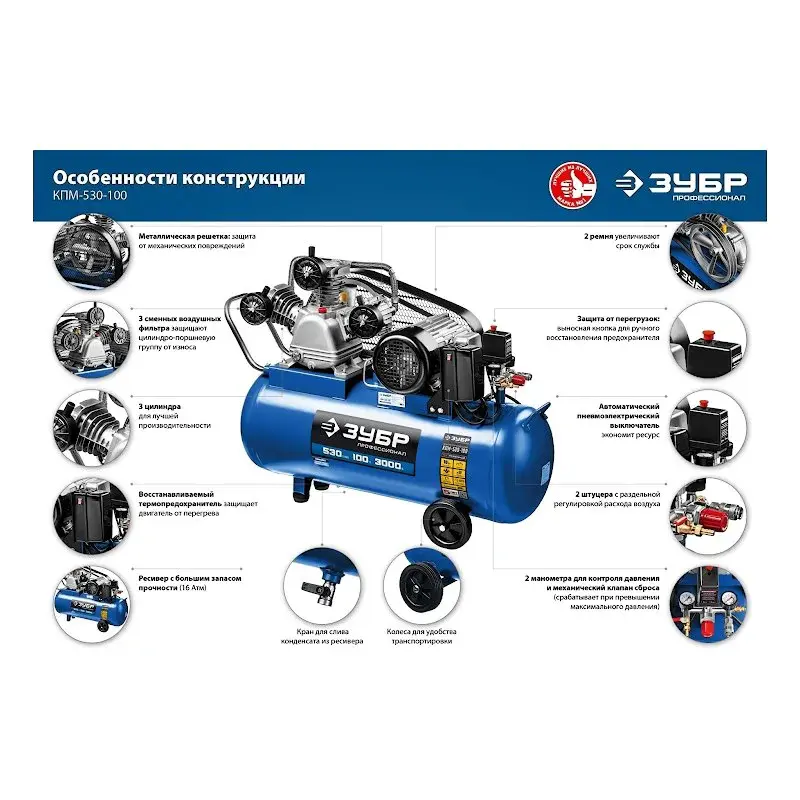 Накрывающий рабочую часть пластиковый кожух предотвращает механические повреждения. Помимо этого, он позволяет избежать контакта с подвижными частями двигателя компрессорной установки Зубр КПМ-530-100.