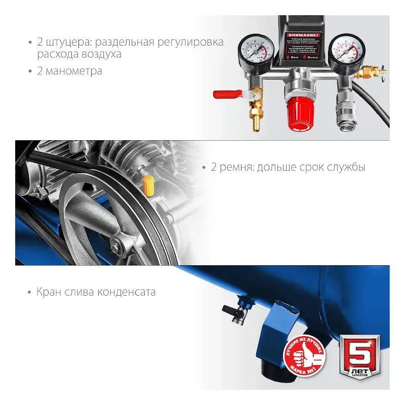 Объем ресивера компрессионной установки — 100 л. Такой емкости достаточно для использования оборудования в профессиональных и бытовых целях – в производстве, строительстве и т.д. Максимальное рабочее давление составляет 10 атм, регулировка осуществляется поворотным рычагом. Следить за показателями можно с помощью аналоговых манометров, отдельных для каждого штуцера.