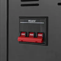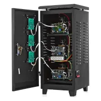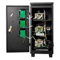 Дисплеи с индикаторами позволяют контролировать работу прибора. На каждую фазу предусмотрен свой LCD-дисплей, отображающий параметры — активацию функций защиты, входное и выходное напряжение и нагрузку.