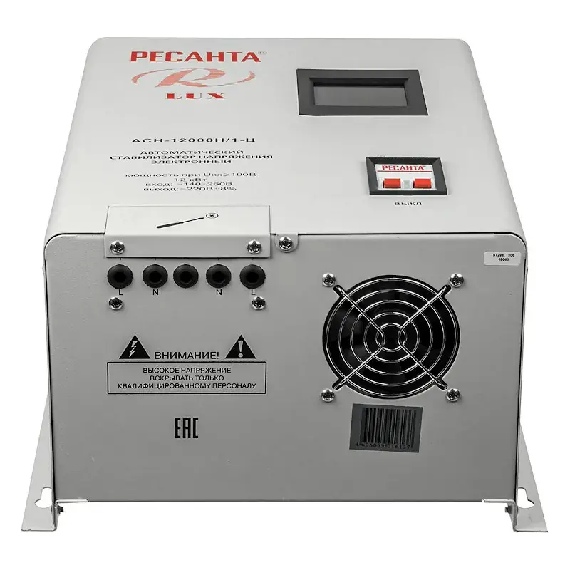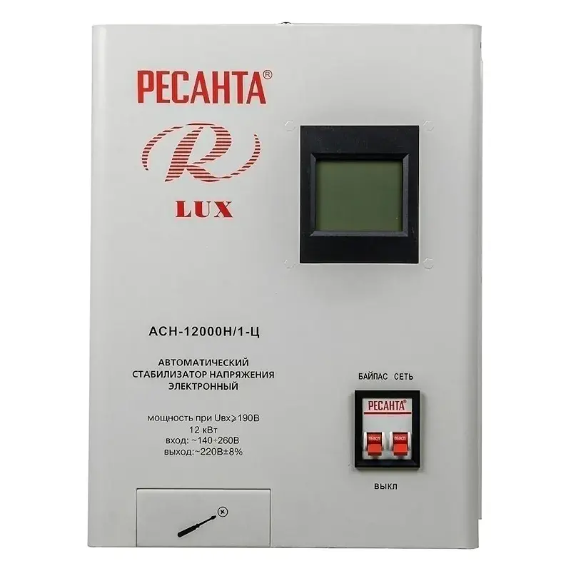 Однофазный цифровой настенный стабилизатор напряжения РЕСАНТА АСН-12000 Н/1-Ц гарантирует правильную и безопасную работу бытовой электроники и производственного оборудования при колебаниях напряжения в бытовой электросети. Стабилизатор выравнивает напряжение постоянного тока до значения в 220 В и защищает подключенные потребители от поломки в результате короткого замыкания или перегрузки.