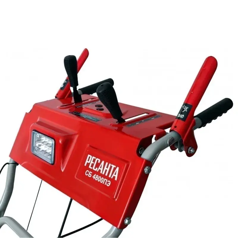 На панели управления снегоуборочной машины Ресанта СБ 4800ПЭ расположен светодиодный фонарь. Так как зимой рано темнеет, подсветка позволит работать в удобное для вас время суток.