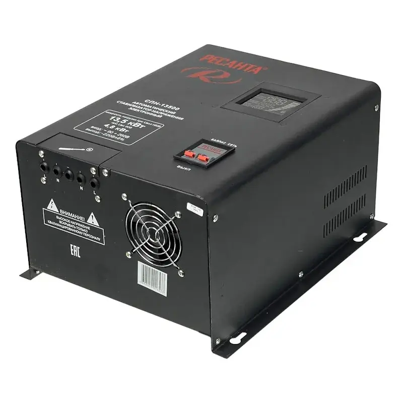 РЕСАНТА СПН-13500 – это однофазный цифровой стабилизатор пониженного напряжения. Представляет собой автотрансформатор с микропроцессорным управлением, предназначенный для обеспечения бытовых потребителей суммарной мощностью до 13,5 кВт стабильным напряжением, с защитой от колебаний в сети и аварийных скачков. Прибор обеспечивает стабилизацию входного напряжения в диапазоне от 90 до 260 В, автоматически отключая потребителей при пиковых скачках на входе и возобновляя подключение при восстановлении питания.