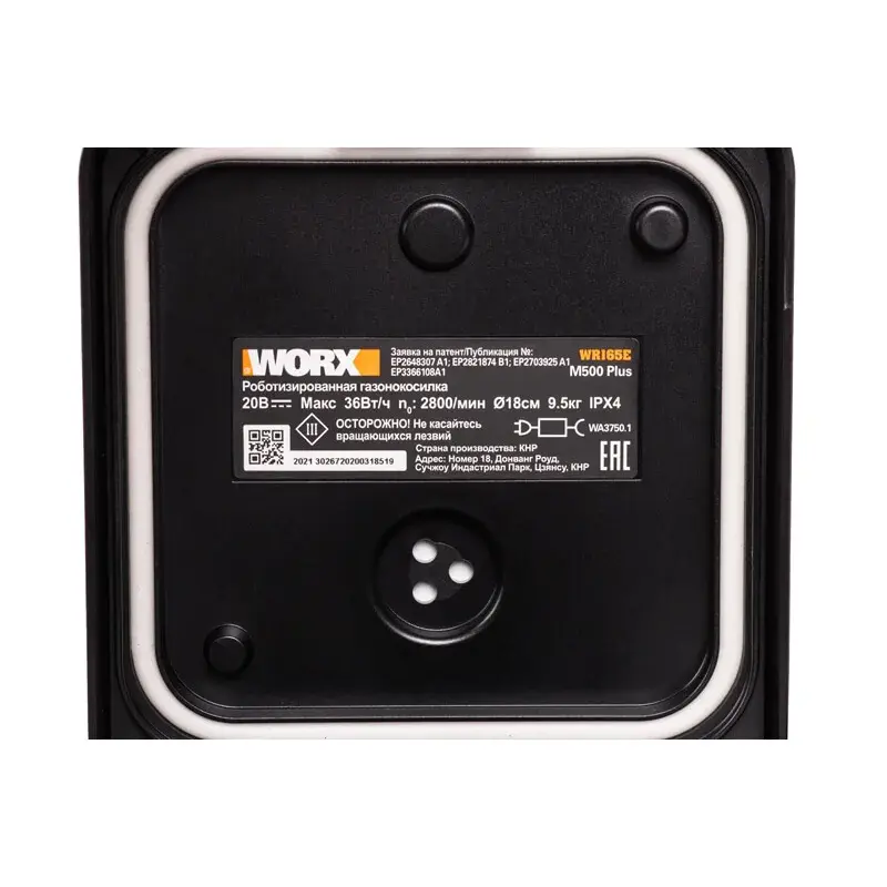 Через решетчатое основание зарядной станции растет трава, что делает его незаметным на газоне. Благодаря влагозащищенному корпусу газонокосилку WORX Landroid M500 Plus WR165E можно очищать струей воды из садового шланга. В конструкции предусмотрены отсеки для установки дополнительных блоков голосового управления, GPS-навигации и системы защиты от ударов.