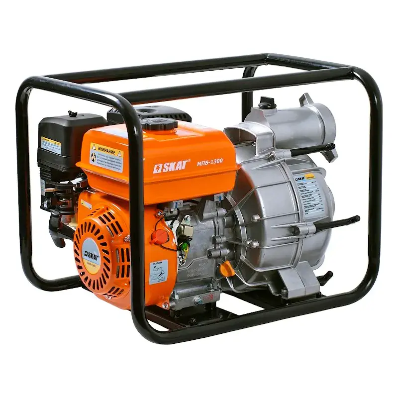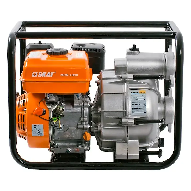 Мотопомпа для загрязненной воды СКАТ МПБ-1300 предназначена для перекачивания жидкостей, в которых содержатся частицы песка, листьев и других примесей размером до 25 мм.