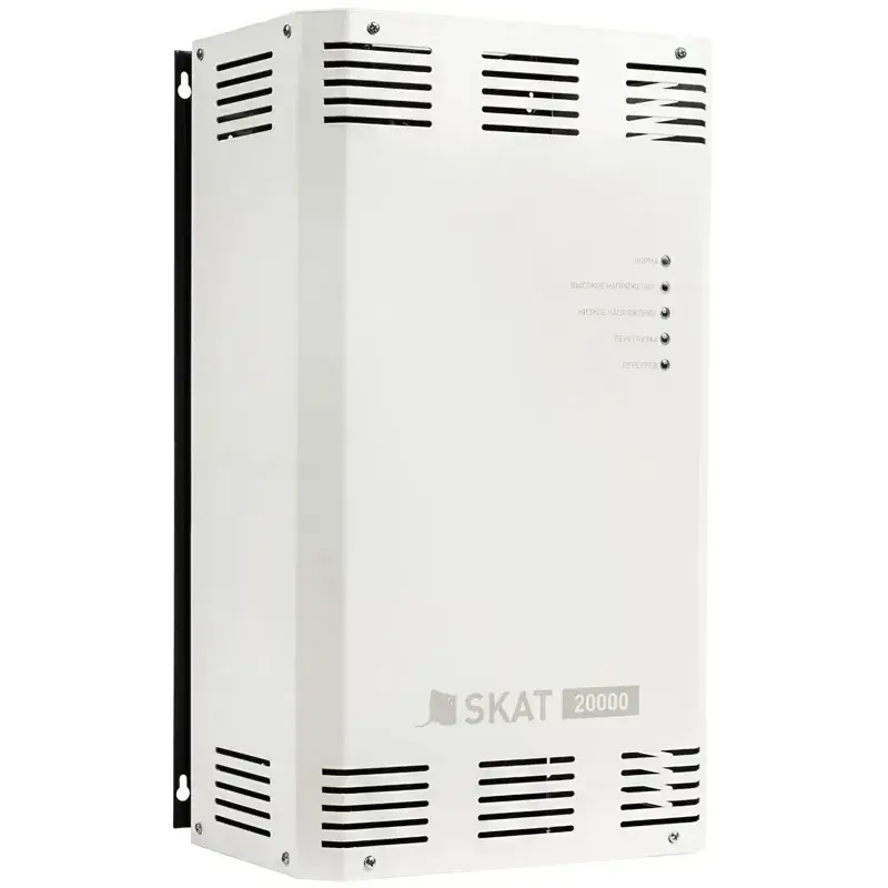 Стабилизатор напряжения SKAT ST-20000 рассчитан на подключение оборудования с потребляемой номинальной мощностью до 13800 Вт. Широкий рабочий диапазон входного напряжения от 140 до 275 В позволяет обеспечить качественное питание нагрузки. Точность стабилизации составляет 7%; скорость переключения — 0,01 секунды.