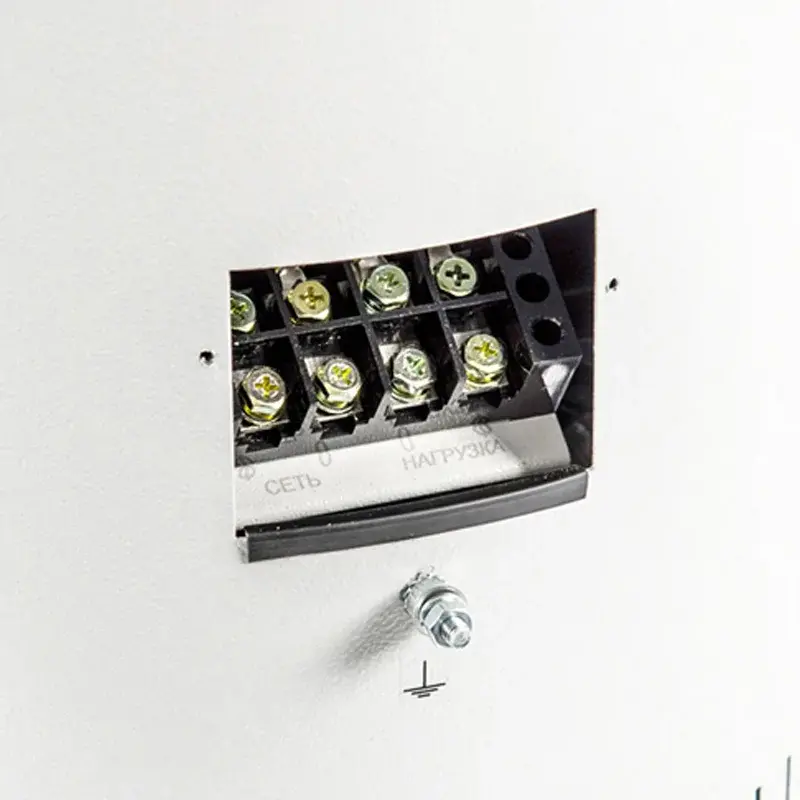 Однофазный стабилизатор напряжения имеет особую конструкцию корпуса, которая способствует естественному конвенционному охлаждению и бесшумной работе. Если охлаждения будет недостаточно, то многоуровневая система защиты, включающая защитное реле и датчики температуры, остановит работу, чтобы избежать перегрева. Для большей надежности системы защиты есть аварийный автоматический выключатель.