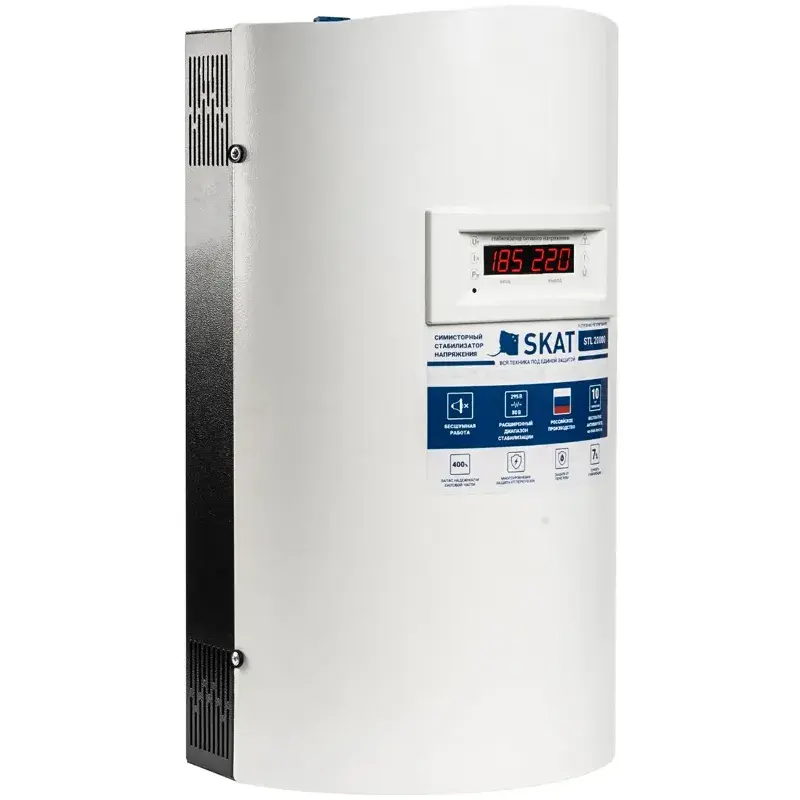 Однофазный стабилизатор напряжения SKAT STL 20000 H оснащен встроенным быстродействующим автоматическим выключателем для защиты питающей сети от перегрузки и короткого замыкания. При перегреве срабатывает противопожарный датчик, отключая нагрузку. Светодиодные индикаторы на передней панели сигнализируют о нештатной ситуации.