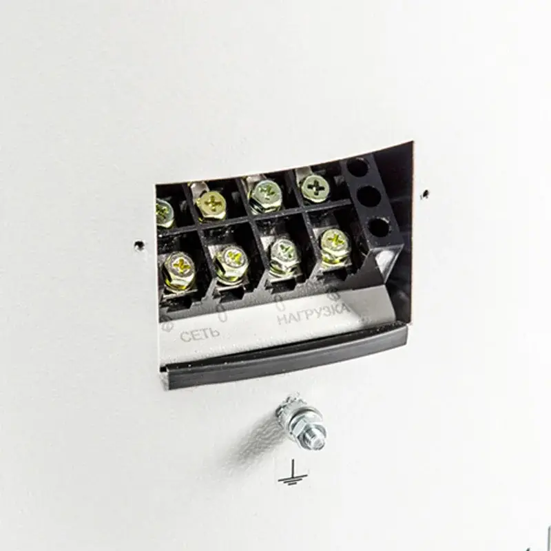 Симисторные ключи управления обладает 4-кратным запасом рабочего тока. За счет них обеспечивается бесшумное и практически мгновенное переключение трансформаторной обмотки. Однофазный стабилизатор напряжения отличается высоким качеством сборки. К этому относится роботизированная пайка, а также изолированные трансформатор и наконечники. Гильзы наконечников обжаты.