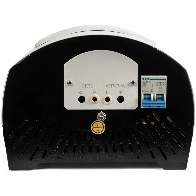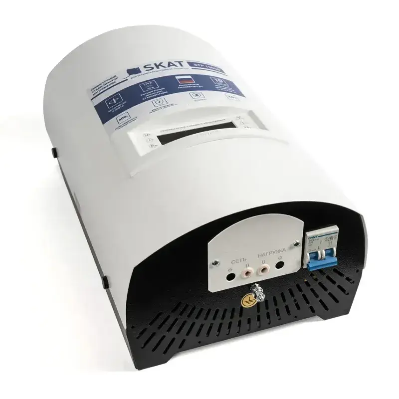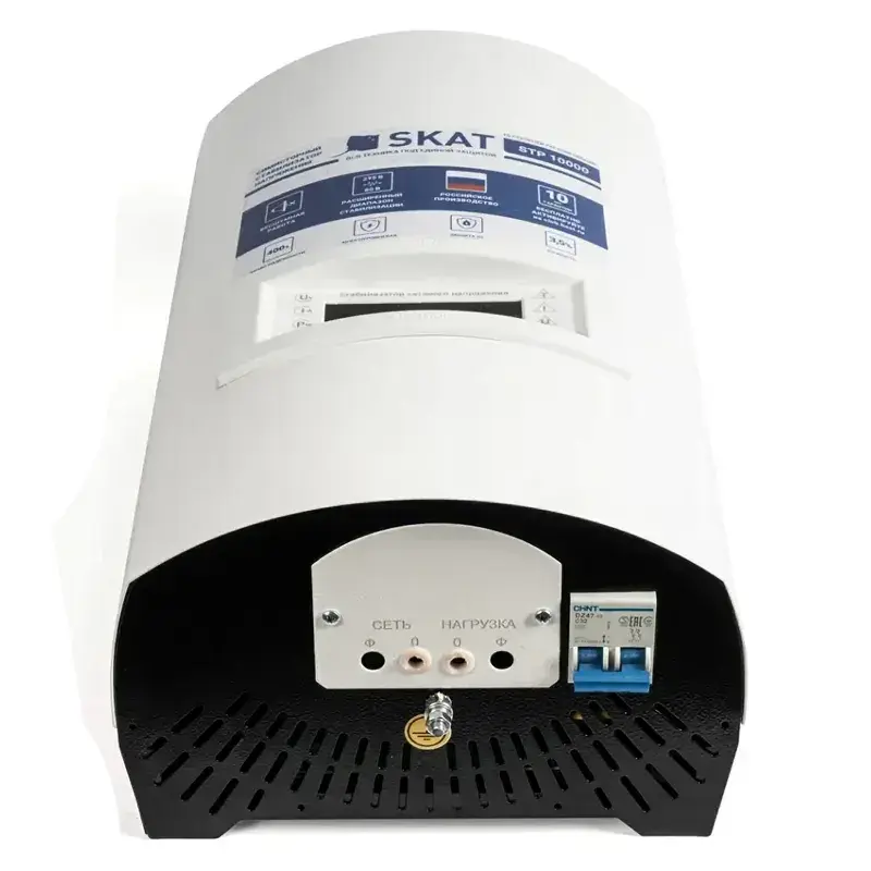 Однофазный стабилизатор напряжения SKAT STP 10000 H имеет встроенный быстродействующий автоматический выключатель для защиты питающей сети от перегрузки и короткого замыкания. При перегреве срабатывает противопожарный датчик температуры, который отключает нагрузку. Светодиодные индикаторы на передней панели сигнализируют об аварийной ситуации.