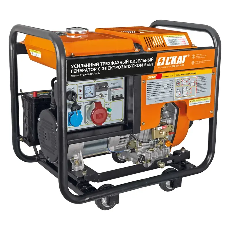 Трехфазный бензиновый генератор СКАТ УГБ-6000ЕT мощностью 6 кВт на 380 вольт и 4 кВт на 220 вольт представляет собой мобильное оборудование как для бытового, так и для профессионального использования. Служит источником питания различных приборов, когда нет возможности подключится к электросети.