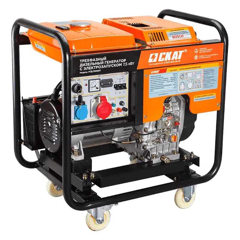 Трехфазный дизельный генератор СКАТ УГД-7500ЕТ мощностью 7,5 кВт обеспечит энергией строительную площадку и станет отличным помощником лесозаготовителям, геологам, ремонтным бригадам.
