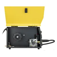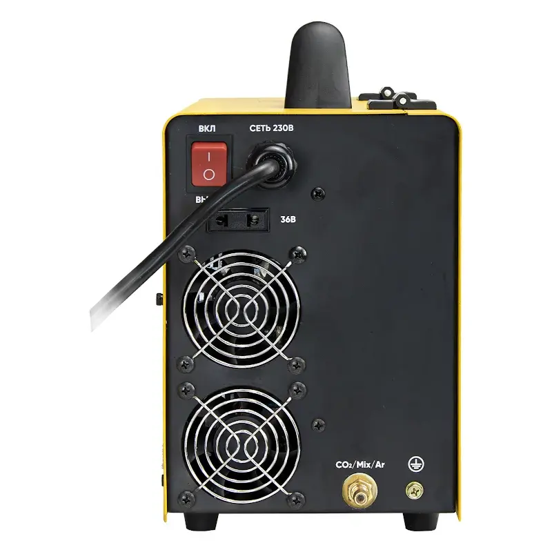 В аппарате установлен термопредохранитель. Он срабатывает при возникновении перегрузки или перегрева. В этом случае на панели управления загорится соответствующий индикатор. Для предотвращения поломки модели сварочный ток будет снижен до минимального значения.