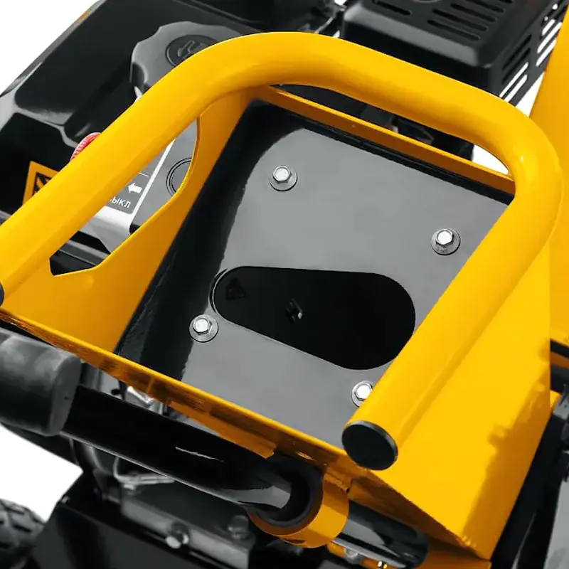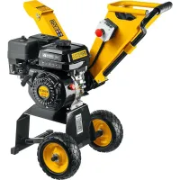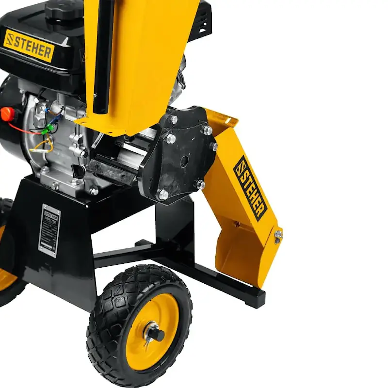 Бензиновый измельчитель веток удобно перемещать по участку благодаря прочной выдвижной ручке и большим колесам. Положение козырька на разгрузочном желобе можно регулировать для изменения угла выброса щепы. Мощная опорная рама обеспечивает устойчивость машины во время работы. Оба желоба складываются для компактного хранения.