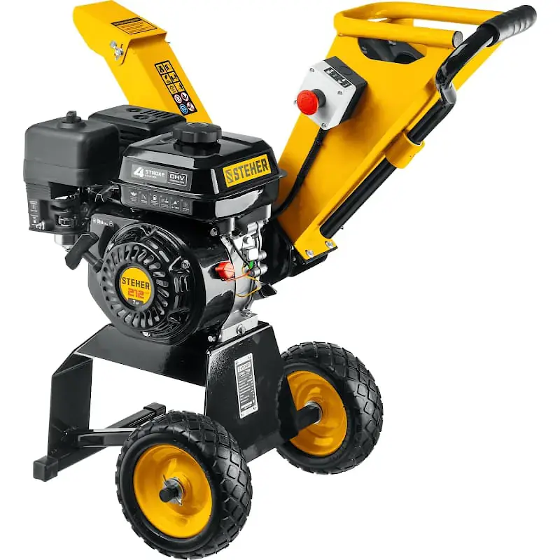 За счет прямой передачи мощности двигателя на ротор и высокой частоты оборотов садовый измельчитель справляется с перемалыванием веток толщиной до 50 мм. Большая аварийная кнопка служит для мгновенной остановки двигателя в случае заклинивания материала.