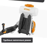 Бензиновый опрыскиватель Stihl SR 450 находит широкое применение в фермерском, коммунальном или приусадебном хозяйстве. Устройство используется для распыления жидкостей, порошка, семян. Дальность действия по горизонтали составляет 14,5 м. Двухтактный двигатель мощностью 3,9 л.с. обеспечивает высокую производительность, достигающую 1300 м3/ч. Для удобства переноски 14-литрового бака опрыскиватель оборудован ранцевой мягкой спинкой и двумя регулируемыми по длине лямками. Ключевые особенности Эффективная антивибрационная система. Подходит для распыления жидкостей и сухих веществ. 2-тактный двигатель с ручным стартером и плавным пуском. Три съемные решетки для формирования потока. Ранцевая конструкция для удобства переноски. Stihl SR 450 в работе В широкую горловину бака удобно заливать жидкости или засыпать гранулы. Элементы управления двигателем и расходом химикатов удобно расположены на рукоятке под правой рукой. Регулятор на распылительной трубе позволяет контролировать и дозировать расход вещества. Сквозь прозрачные стенки бензобака удобно отслеживать уровень топливной смеси для выполнения своевременной заправки. Скорость воздушного потока достигает 90 м/с, что обеспечивает высокую производительность бензинового опрыскивателя Stihl. Три съемные решетки придают струе определенную форму: конусообразную, разделенную на две части или отклоненную в сторону. Комфортное использование Пружинные амортизаторы между спинкой ранцевой оснастки и конструкцией аппарата гасят вибрации и повышают комфорт при длительной работе. Широкие мягкие лямки не натирают плечи. Длина ремней регулируется. Спинка ранца хорошо вентилируется, не допуская передачи тепла от горячего двигателя. Стабильный запуск Демпфирующий элемент на рукоятке ручного стартера сглаживает толчки при запуске двигателя опрыскивателя Stihl SR 450. Пусковое устройство не требует приложения излишних усилий при вытягивании троса. Остывший двигатель легко запускается благодаря насосу предварительной подкачки топливной смеси в карбюратор.