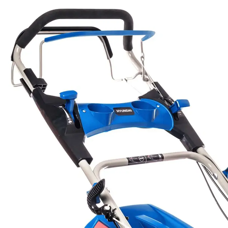 Привод на задние колеса позволяет удобно разворачиваться и маневрировать. Передние установлены на поворотные механизмы, которые блокируются при необходимости - так косилка Hyundai L 5110RS не скатится с неровной поверхности при остановке. За счет этого обеспечивается простое управление и кошение травы вокруг клумб или деревьев. Задние колеса увеличены, по сравнению с передними. Благодаря конструкции вы можете обрабатывать участки даже с неровным ландшафтом.