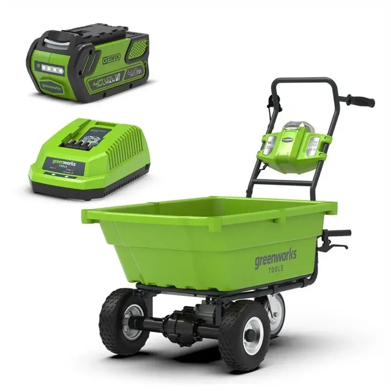 Тележка садовая самоходная Greenworks G40GCK4 7400007UB - это самоходная модель, которая перевозит груз общей массой до 100 кг и максимальным объемом в 106 литров. Нужно перенести тяжелые декоративные камни для сада или строительные материалы, садовая тележка Greenworks легко справится с этой задачей. Работает от аккумулятора серии 40 Вольт, мощности которого достаточно для транспортировки по наклонным дорогам. Ковш снабжен выемками для установки бортов и ремней, надежно закрепляющих грузы на тележке. Модель имеет 3 скорости - 2 вперед и 1 назад. Максимальная скорость равна 4,2 км/ч при движении вперед и 2,4 км/ч при обратном ходе. Подъемный механизм работает по принципу самосвала, позволяя без усилий очистить тележку от тяжелого груза. Стояночный тормоз надежно «закрепит» технику на месте, даже если она будет находиться под наклоном. Мощные колеса с давлением 2,0 - 2,7 атмосфер выдержат заявленный вес и прослужат долгое время. Время работы от одного заряда аккумулятора емкостью 4 Ач - до 45 минут или в проезжаемой дистанции - до 3 км. Какими плюсами обладает данная модель? Уникальная самоходная тележка Greenworks избавит вас от проблем с перевозкой тяжелых грузов по саду или стройплощадке. У этой модели предусмотрено все - от стояночного тормоза до автоматической выгрузки тяжелого груза. Батарея и зарядное устройство Greenworks можно использовать с более чем 20 рабочими инструментами серии 40 Вольт, при этом значительно экономя на последующих покупках. Гарантия в 2 года говорит об уверенности Greenworks в высоком качестве производимого инструмента. В комплект входит: самоходная аккумуляторная тележка G40GC, артикул 7400007; аккумулятор G40B2 4 Ач, артикул 29727; зарядное устройство Greenworks G40C, артикул 2904607; руководство по эксплуатации; гарантийный талон.