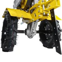 Корпус мотоблока оборудован колесной парой. Это обеспечивает удобство и отсутствие лишней нагрузки при перемещении машины по участку. Реверсивная передача позволяет безопасно извлекать фрезы из почвы при буксовке. Элементы управления вынесены на рукоятки для удобства управления.