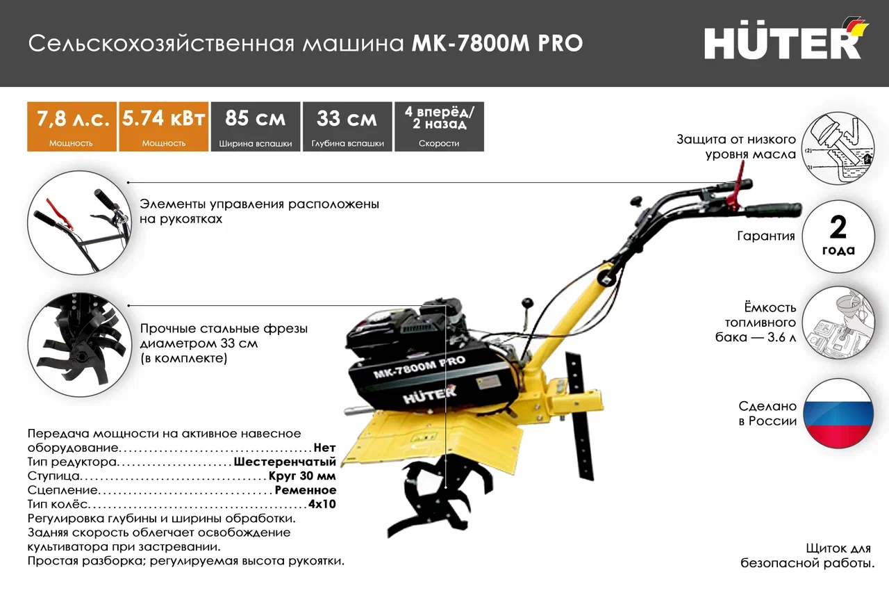 Бензиновый мотоблок HUTER МК-7800P PRO используется для обработки почвы и обладает мощностью 7,8 л.с. Благодаря регулировке ширины и глубины обработки вы можете адаптировать оборудование для работ с нужным участком.