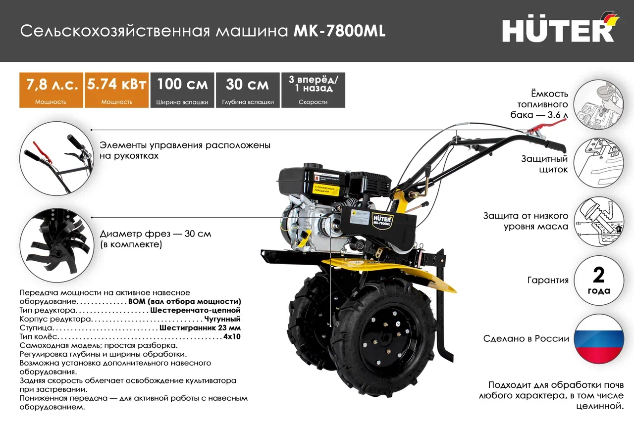 Мотоблок Huter МK-7800PL с мощностью 5,74 кВт – это самая высокопроизводительная модель серии, которая оснащена коробкой передач с 4 скоростями. За один проход культиватор обрабатывает землю шириной до 1 м.