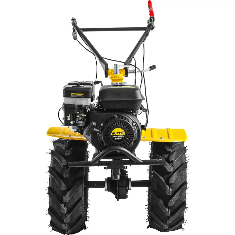 Мотоблок Huter МК-8000P BIG FOOT оснащена шестигранной ступицей на 23 мм, которая дает возможность использовать грунтозацепы и большие колеса. Благодаря глубокому протектору шин машина без труда проходит вязкую и рыхлую землю, не застревая в ней. Чугунный корпус редуктора защищает механизм от повреждений при наезде на твердые препятствия.