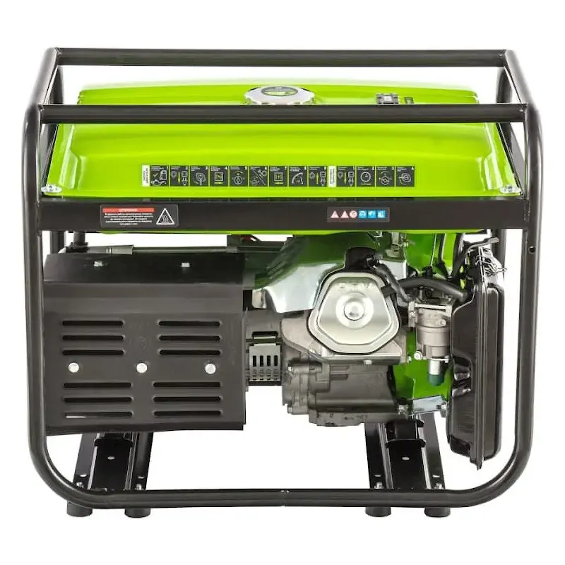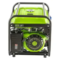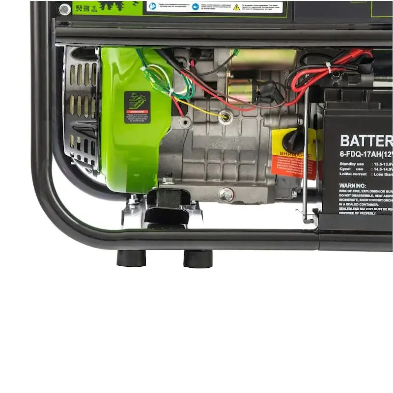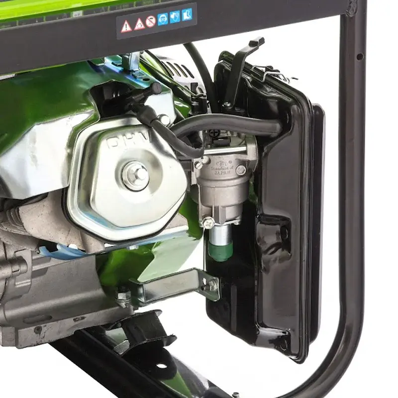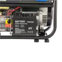 Бензиновый генератор оснащен 4-тактным двигателем объемом 420 см3 мощностью 15,1 л.с., вырабатывает однофазный переменный ток частотой 50 Гц. Электростартер максимально упрощает запуск двигателя. Аккумулятор для него входит в комплект поставки. Для запуска после долгого простоя или в случае разрядки аккумулятора предусмотрен ручной стартер. Электрогенератор с контролем напряжения AVR подходит для питания компьютеров и другой чувствительной техники.